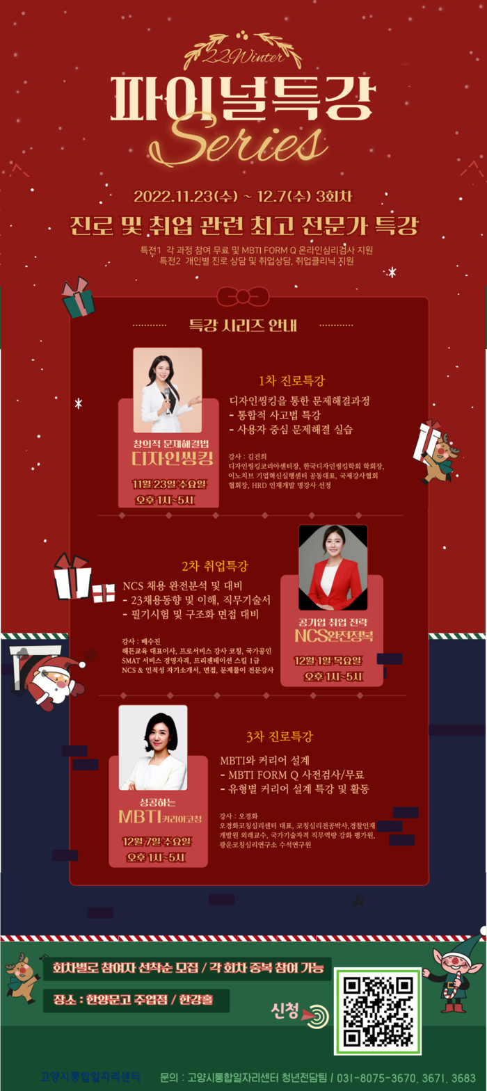 12월 7일 ‘진로탐색을 위한 MBTI 성격유형 분석’은 △MBTI 검사의 이해, 유형별 특징 △MBTI 성격유형별 진로탐색, 커리어설계 등에 대해 배우고 선호지표 및 유형별 실습 활동을 한다.