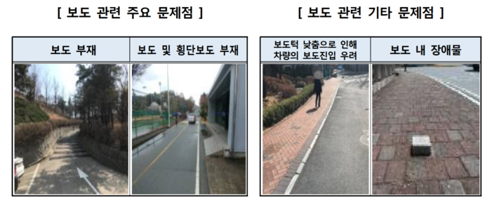 앞서 대학 내 교통사고 발생 사례가 있는 20개 대학 399개 구역의 교통안전실태를 조사한 결과에 따르면 20개 대학 225개 구역(56.4%)에서 보도·차도 미분리, 보도 단절, 보도 내 장애물 방치 등의 문제점이 확인됐다.