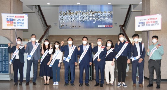 ▲박완수 경남도지사(왼쪽 여섯 번째)가 도청 본관 1층에서 청렴캠페인을 진행하고 있다. 경남도 제공 |