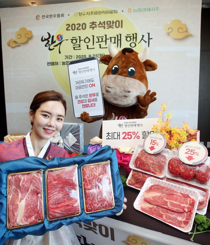 | ▲22일 더플라자호텔 서울에서 한우자조금관리위원회가 주최한 ‘2020 추석맞이 한우 할인판매 행사’ 포토행사에 홍보모델이 건강과 면역력에 도움이 되는 우리 한우를 선보이고 있다. 오는 29일까지 진행되는 ‘2020 추석맞이 한우 할인판매 행사’에서는 코로나19와 수해 등으로 침체된 명절 분위기 속에 위로와 힘이 되고자 건강과 면역력에 도움이 되는 우리 한우를 최대 25% 저렴하게 구입할 수 있다. (사진=한우자조금 제공) |