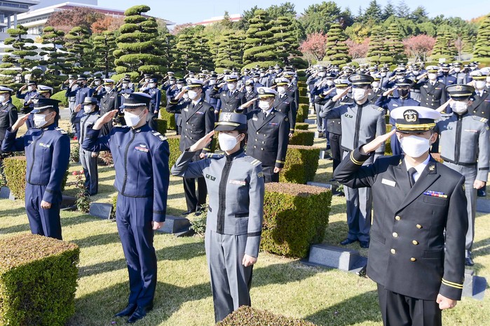 19일 합동순항훈련의 첫 기항지인 부산에 입항한 육・해・공・간호사관생도들이 6・25전쟁 당시 대한민국을 위해 싸우다 희생된 유엔군 전몰장병과 선배 전우의 희생정신을 기리며 참전용사 묘역 앞에서 경례를 하고 있다.