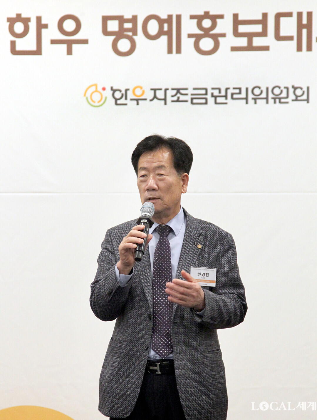 6일 서울 중구 대한상공회의소에서 열린 ‘2026 한우 명예홍보대사 위촉식’에서 민경천 한우자조금관리위원장이 인사말을 하고 있다.