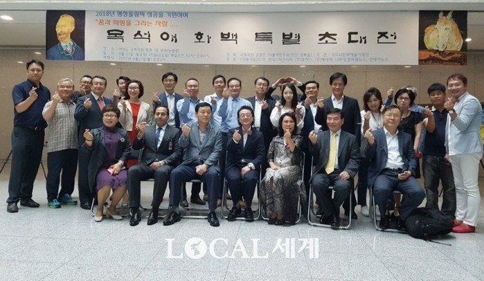 ▲목석애 화백 특별 초대전에 참석한 내빈들이 기념촬영을 하고 있다. |
