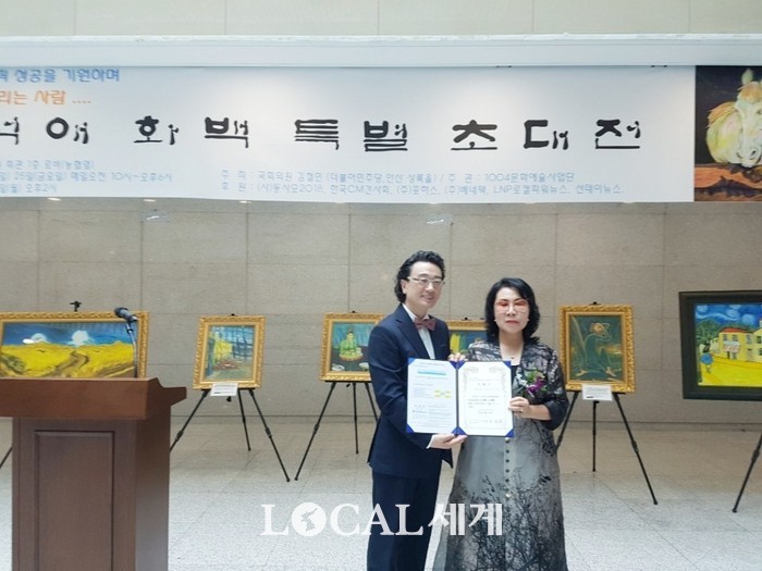 ▲원호경 동사모2018 이사장(오른쪽)이 목석애 화백을 동사모2018 홍보대사로 위촉하고 기념촬영을 하고 있다. |