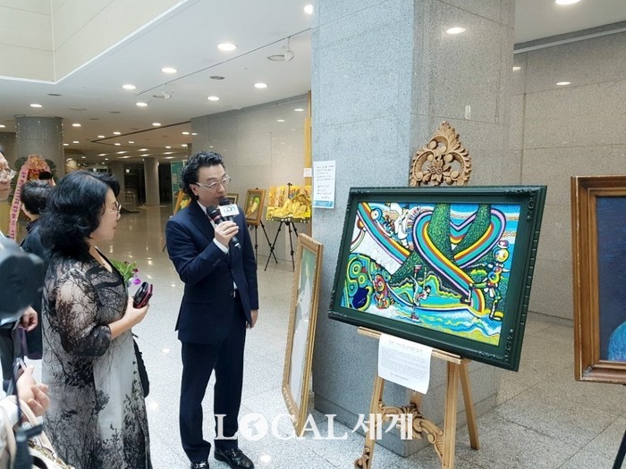 ▲ 목석애 화백이 평창동계올림픽 소재 그림을 설명하고 있다. 김재덕 기자. |