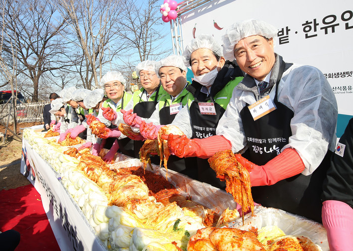 ▲한돈자조금은 30일 여의도 국회의사당 옆 생생텃밭에서 ‘국회 텃밭 · 한유연과 함께하는 한돈 김장 행사’를 개최했다. 국회 생생텃밭에서 김장을 하고 있는 국회의원 및 참가자들 (오른쪽부터 한돈자조금 하태식위원장, 정세균 국회의원, 문희상 국회의장, 설훈 민주당 의원, 백재현 민주당 의원)/한돈자조금 제공. |