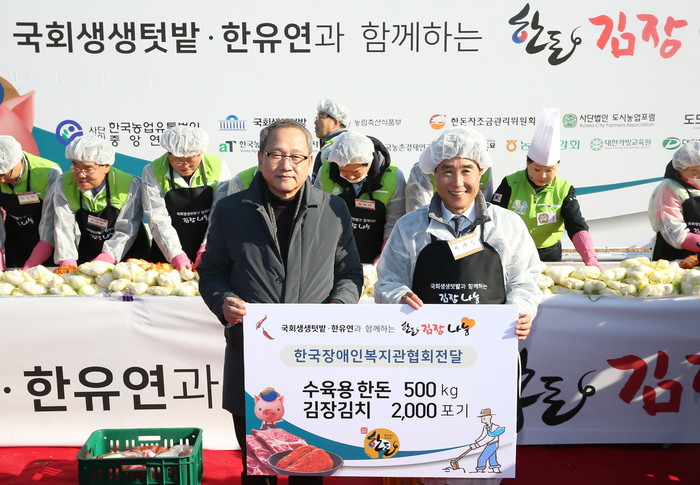 한돈 농가 비영리단체 한돈자조금관리위원회(위원장 하태식)는 김장철을 맞아 직접 담근 김장김치 2000포기와 한돈 수육 500kg을 장애인단체에 전달했다.