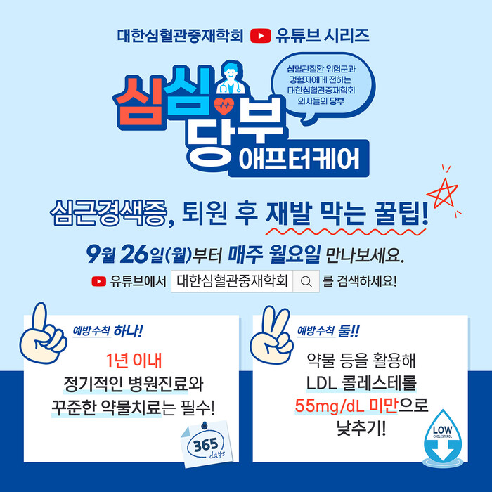 올해는 특히 ‘심근경색증’으로 치료 및 퇴원한 후, 첫 1년이 재발을 막는 데 가장 중요한 시기임을 알리고 구체적인 핵심 예방 수칙을 소개하는 데 초점을 뒀다. 캠페인의 일환으로 학회 소속 심혈관질환 전문의들이 직접 참여한 유튜브 영상 시리즈 ‘심심당부(심혈관질환 위험군과 경험자에게 전하는 대한심혈관중재학회 의사들의 당부) 애프터케어’가 학회 공식 유튜브 채널 ‘대한심혈관중재학회KSIC’에 26일(오늘)부터 10월 17일까지 매주 월요일, 한 편씩 순차 공개된다.
