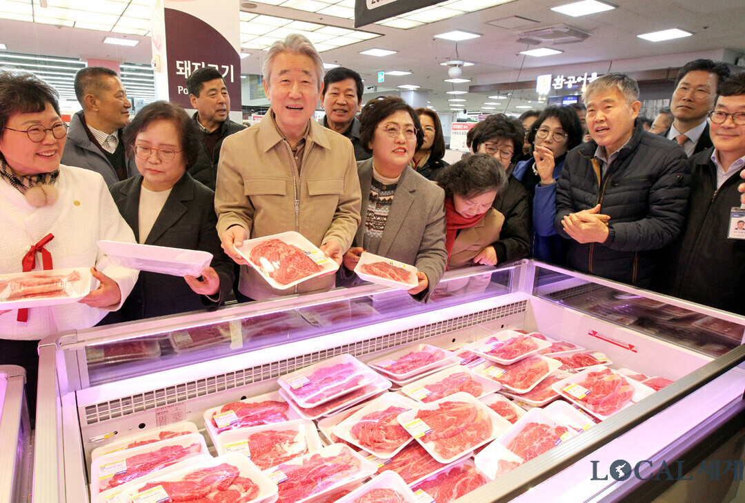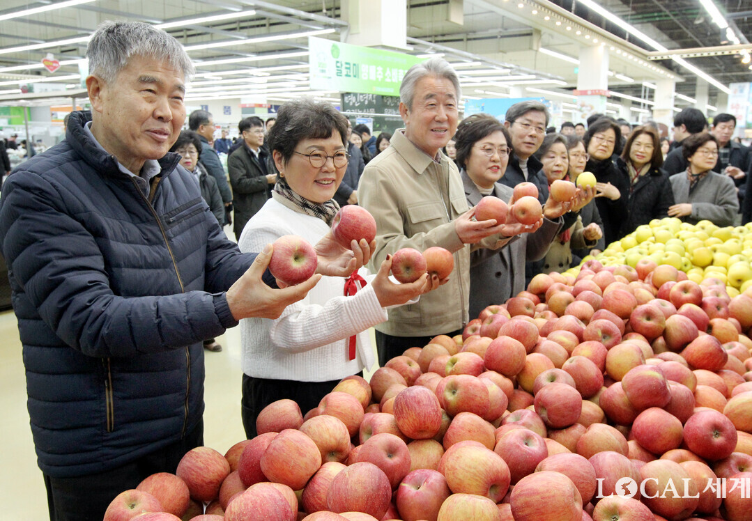 농협은 설 명절을 앞두고 26일부터 2월 20일까지 전국 농협하나로마트 등에서「농심!천심!동심!(農心!天心!同心!) 특별할인행사」를 실시한다. 강호동 농협중앙회장이 농축협 조합장, 한국소비자연맹회장 등 관계자들과 매장을 순람하고 있다.