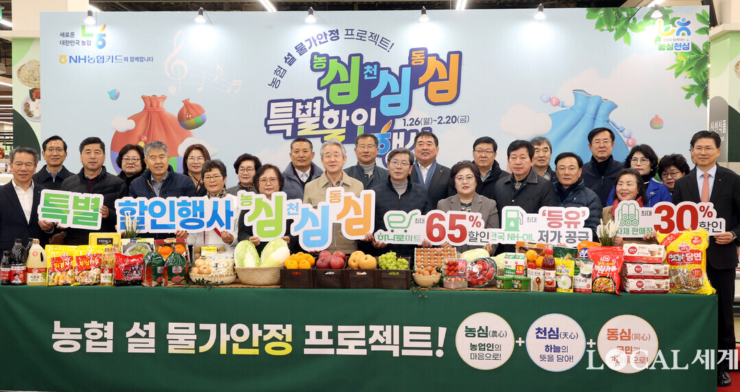 농협은 설 명절을 앞두고 26일부터 2월 20일까지 전국 농협하나로마트 등에서「농심!천심!동심!(農心!天心!同心!) 특별할인행사」를 실시한다. 강호동 농협중앙회장이 농축협 조합장, 한국소비자연맹회장 등 관계자들과 기념촬영을 하고 있다.