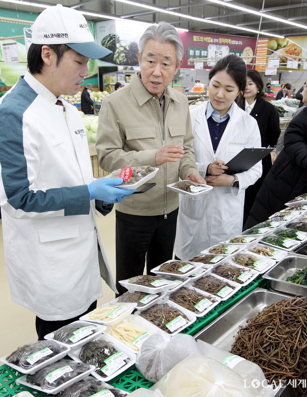 농협은 설 명절을 앞두고 26일부터 2월 20일까지 전국 농협하나로마트 등에서「농심!천심!동심!(農心!天心!同心!) 특별할인행사」를 실시한다. 강호동 농협중앙회장이 식품안전 관계자들과 나물 매장을 점검하고 있다.