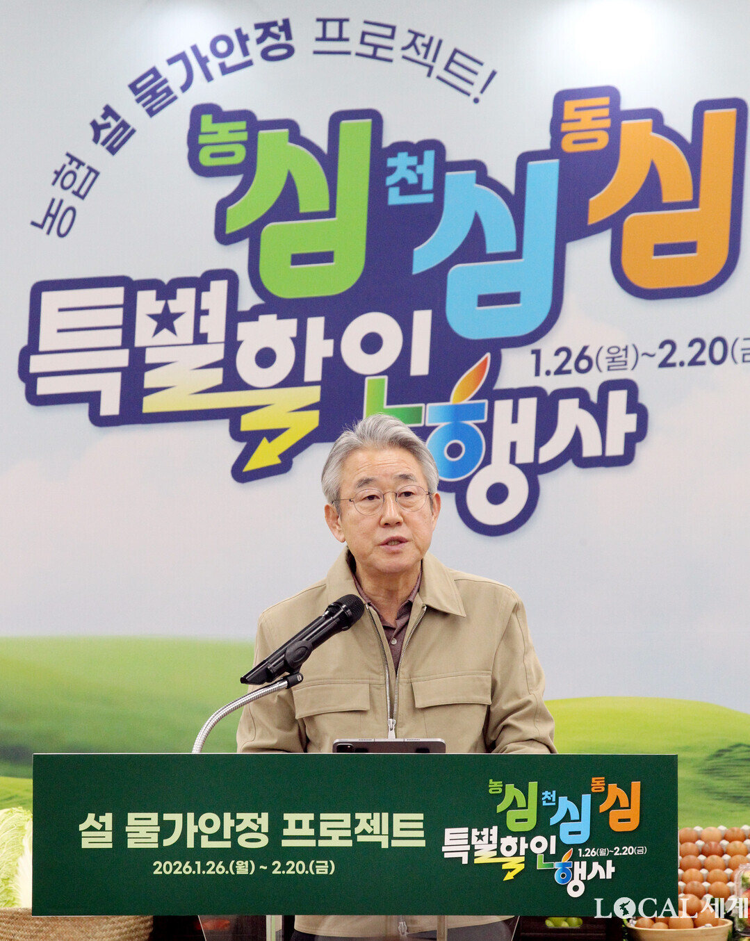농협은 설 명절을 앞두고 26일부터 2월 20일까지 전국 농협하나로마트 등에서「농심!천심!동심!(農心!天心!同心!) 특별할인행사」를 실시한다. 강호동 농협중앙회장이 인사말을 하고 있다.