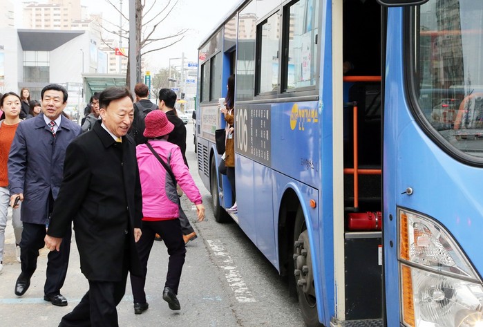 ▲설동호 대전시교육감은 8일 오전 기관장 시내버스 출근 릴레이 캠페인에 동참하기 위해 버스에 승차하고 있다. |