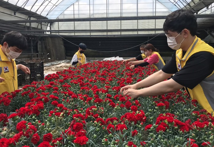 서울농협 직원 및 대학생 봉사단은 경기도 이천시 백사면에 소재한 화훼 농가를 찾아 카네이션 수확 및 포장 작업에 구슬땀을 흘렸다.
