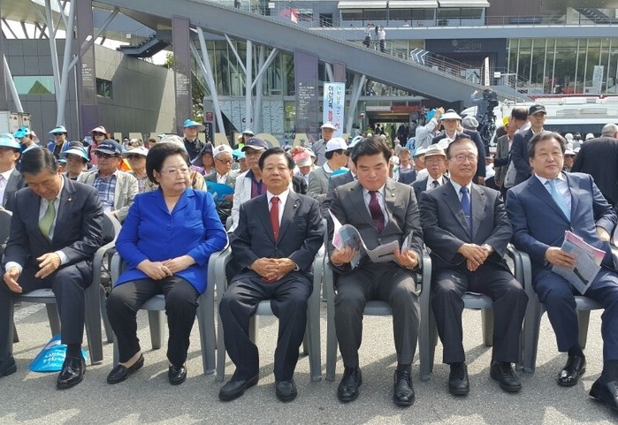 ▲25일 경기도 파주시 임진각 평화누리공원 망배단에서 열린 제34회 이산가족의 날 기념식에 참석한 새누리당 김무성 당대표, 이동복 일천만 이산가족 고문, 원유철 원내대표, 설용수 공동대회장, 김을동 의원, 황진하 사무총장(오른쪽부터)이 기념식 행사를 바라보고 있다. |