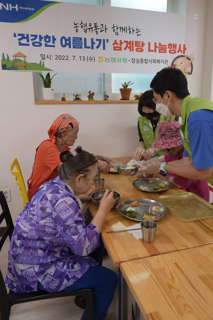 농협유통 관계자는 “어르신들이 삼계탕을 드시고 무더운 여름을 건강하게 보내실 수 있었으면 하는 마음에 정성스럽게 준비했다”며, “농협유통은 지역사회와의 연계를 강화하는 ESG경영의 일환으로서 봉사활동을 적극적으로 진행할 것”이라고 밝혔다.
