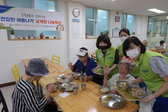 농협유통 임직원들은 이날 더위에 취약한 어르신들의 건강한 여름나기를 기원하기 위해 직접 만든 삼계탕을 나누며 어르신들의 건강과 행복을 기원했다.