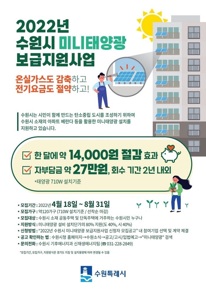 [로컬세계 김병민 기자]경기 수원시는 ‘2022년 미니태양광 보급 지원사업’ 신청자를 8월 31일까지 선착순으로 모집한다.