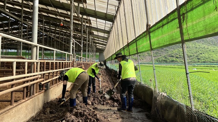 ▲ 농협물류 직원들이 축사에서 일손돕기를 하고 있다. |
