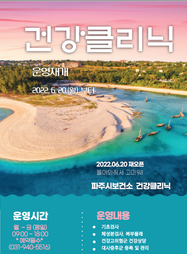 이에 시는 ‘대사증후군 건강클리닉’ 운영해 심뇌혈관질환 등 심각한 질환으로 이행되는 것을 예방하고자 하며, 대사증후군 건강클리닉은 파주시민을 대상으로 평일 오전 9시부터 오후 6시까지 예약제로 운영된다.