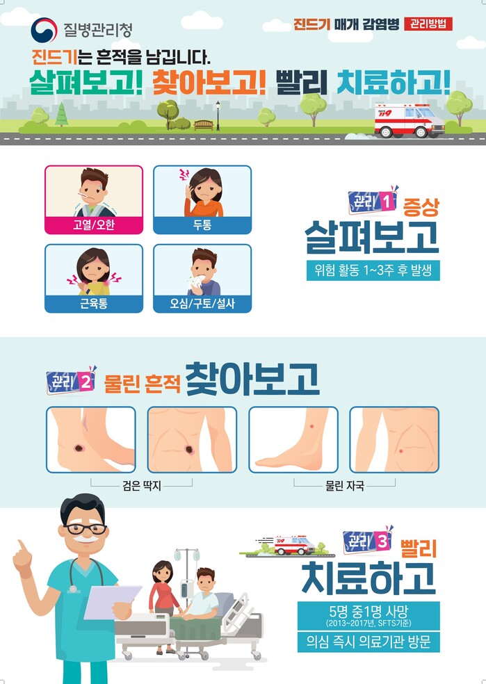 9~11월은 쯔쯔가무시증을 옮기는 털진드기 유충이 왕성히 활동하는 시기로 야외활동 시 주의가 필요하다. 감염된 털진드기 유충에 물리면 유충이 피를 빨아먹은 부위에 딱지가 동반된 궤양이 생긴다. 잠복기는 보통 1~3주 정도이며 잠복기가 지나면 발열, 오한, 두통 등의 증상이 나타난다.