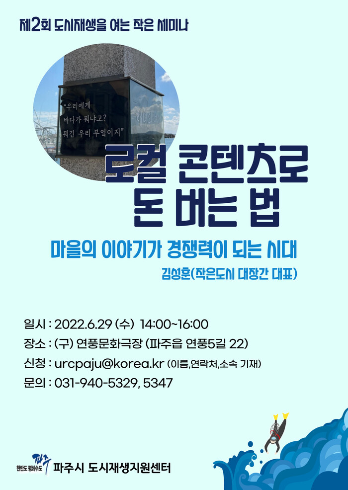 이 세미나는 김성훈 ‘작은도시 대장간’ 대표가 강사로 나서 ‘로컬 콘텐츠로 돈 버는 법’이라는 주제로 강연하며, 해당 분야 전문가와 파주시민이 함께하는 자유토론도 진행된다.