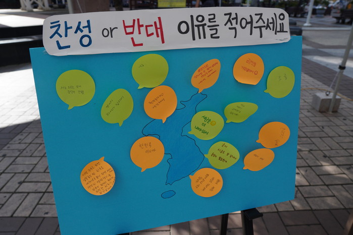 ▲13일 창원시에서 진행 된 통일캠페인에서 시민들의 통일의식 조사 보드판 모습. |