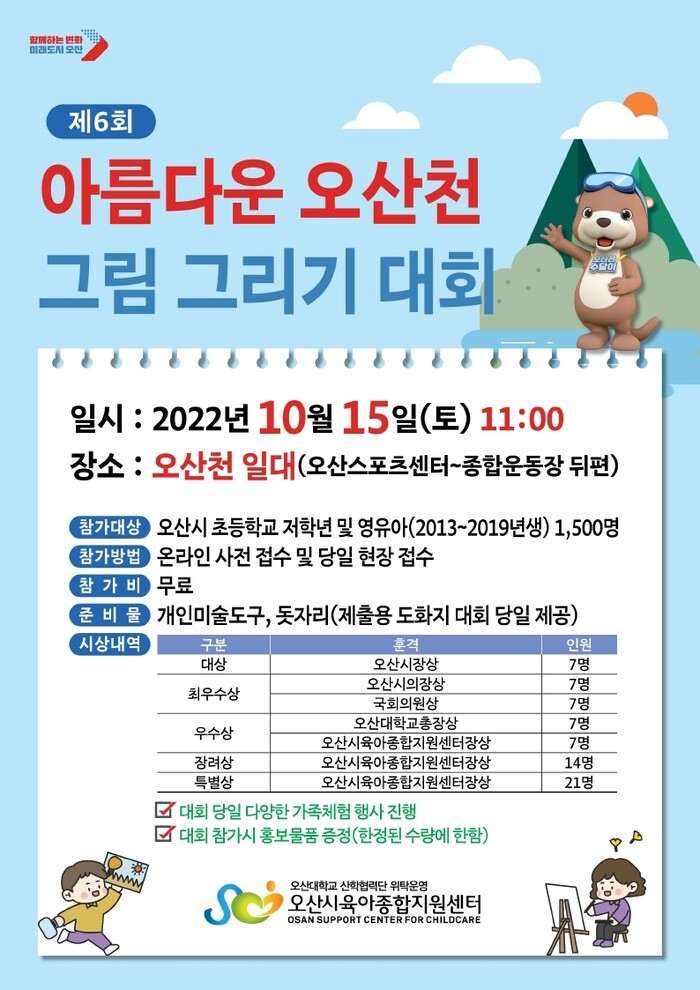 올해로 6회를 맞이하는 이번 대회는 시민 친화형 친수 하천인 오산천(오산스포츠센터~종합운동장 뒤편)에서 ‘맑고 아름다운 오산천 그림 그리기’를 주제로 진행된다. 참가 대상은 2013년부터 2019년에 태어난 영유아 및 초등학교 저학년이다.