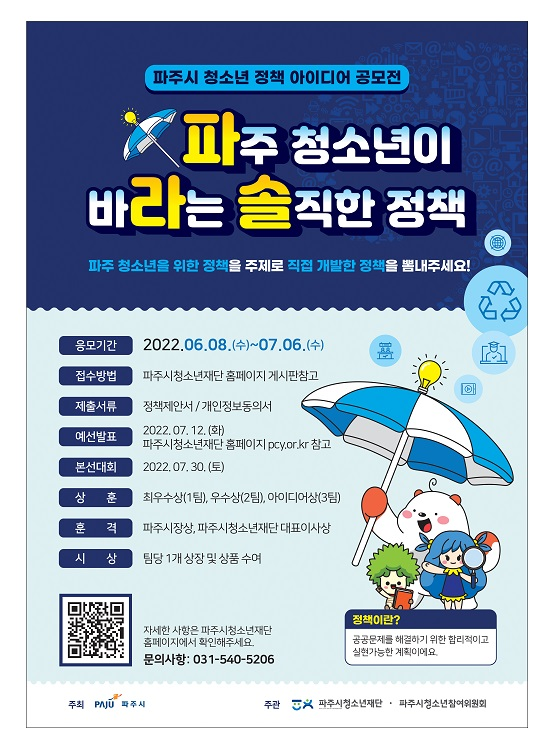 이번 공모전은 파주시 관내 거주 또는 재학 중인 만 9세~24세 청소년이라면 개인 또는 5인 이내의 팀으로 누구나 참여할 수 있으며, 예선심사 및 본선대회를 거쳐 ▲최우수상(1팀) ▲우수상(2팀) ▲아이디어상(3팀)을 선발할 예정이다.