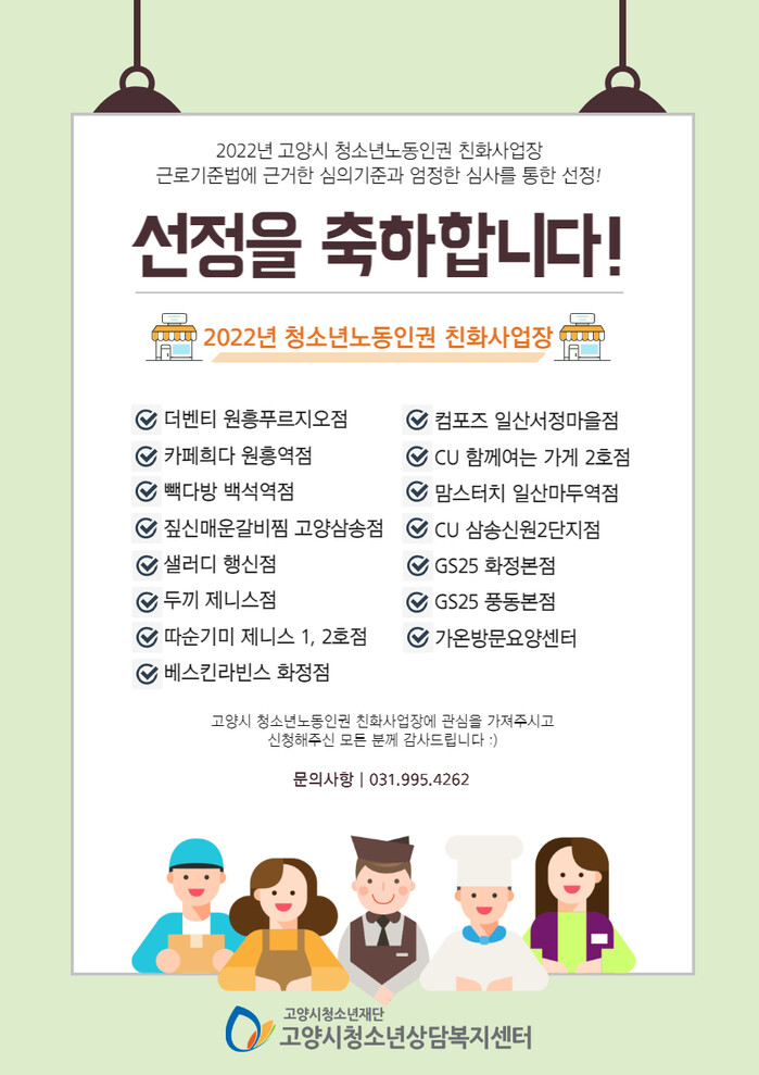 ▲ 고양시청소년상담복지센터는 고양시 청소년 노동인권 보호 및 증진 조례에 따라 청소년의 노동인권 보호 및 개선할 사업장 15곳을 선정하였다. 고양시 제공 |