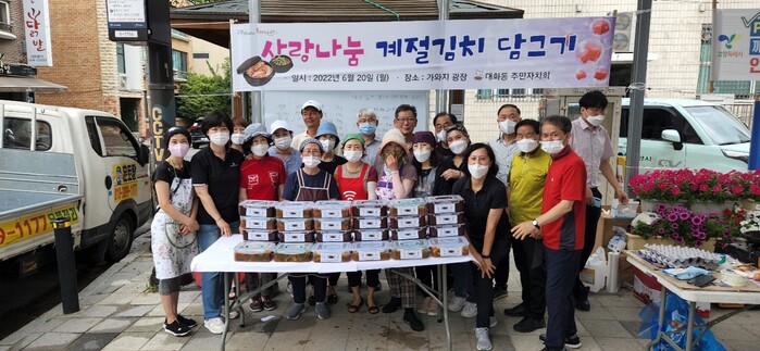 [로컬세계 = 이영원 기자]경기 고양시 일산서구 대화동 주민자치회(회장 손종환)는 지난 20일 대화동 행정복지센터앞에서 계절김치(열무김치)를 직접 담가 대화동 취약계층 25가구에 전달했다.