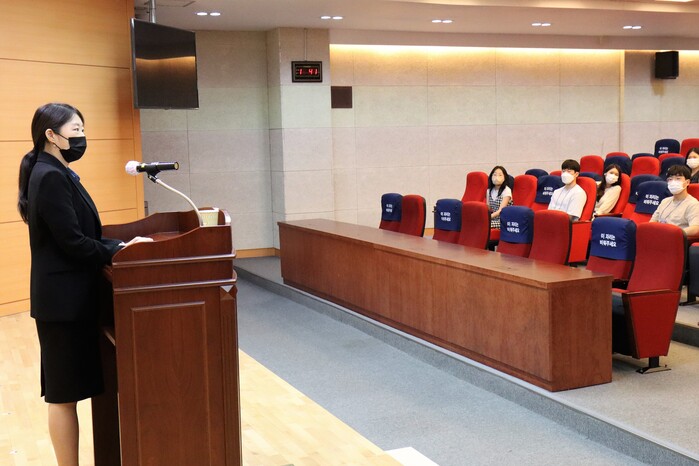 ▲2022년 전국 대학생 관세행정 체험캠프 개회식에서 인사말을 하는 김지현 관세청 대변인. 관세청 제공 |