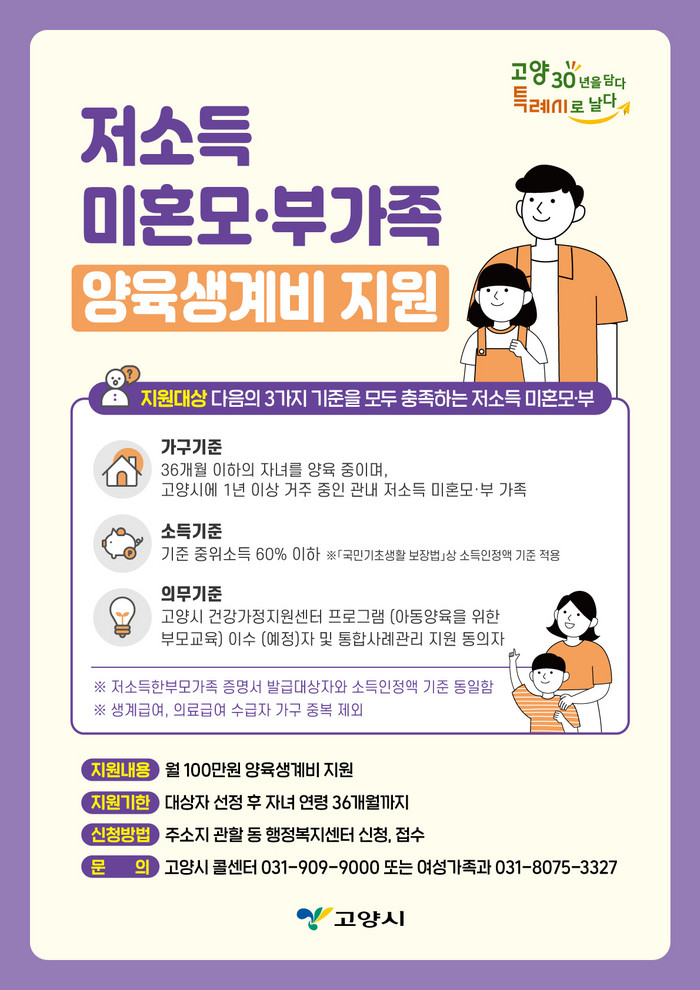 ▲ 고양시 저소득 미혼모부·가족 양육생계비 지원 사업 안내 포스터. 고양시 제공 |