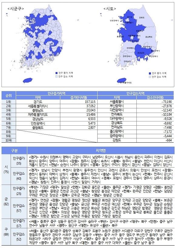 주민등록인구는 2017년말 기준 5177만8544명으로 전년 대비 0.2% 증가했다. 세대당 인구수는 2.39명으로 전년(2.43명) 대비 0.04명 감소했다.
