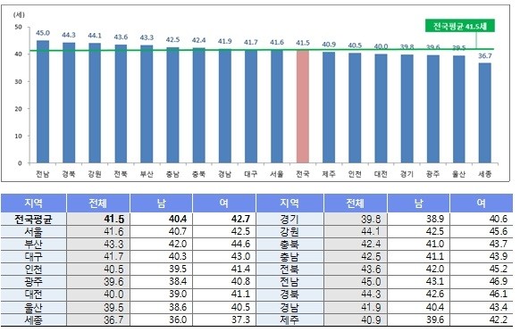주민등록인구의 전국 평균연령은 41.5세로 전년보다 0.5세 증가했다. 남자는 40.4세, 여성은 42.7세로 나타났다.
