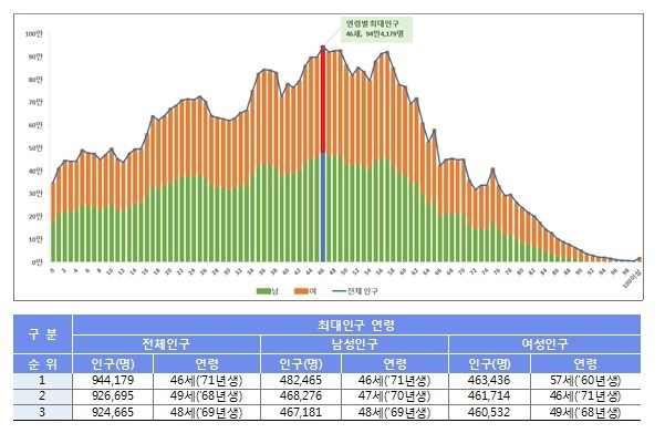 가장 인구가 많은 연령은 46세(1971년생로 94만4179명으로 나타났다.