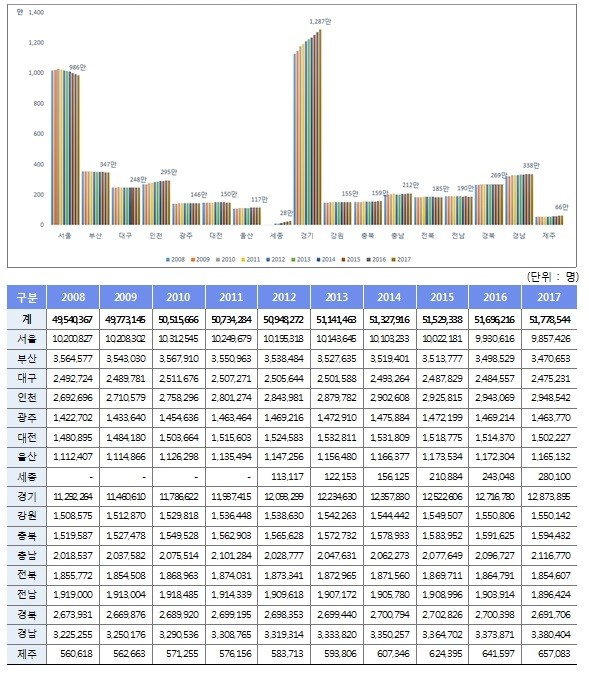 ▲연도별·시도별 주민등록인구(2008~2017년). |