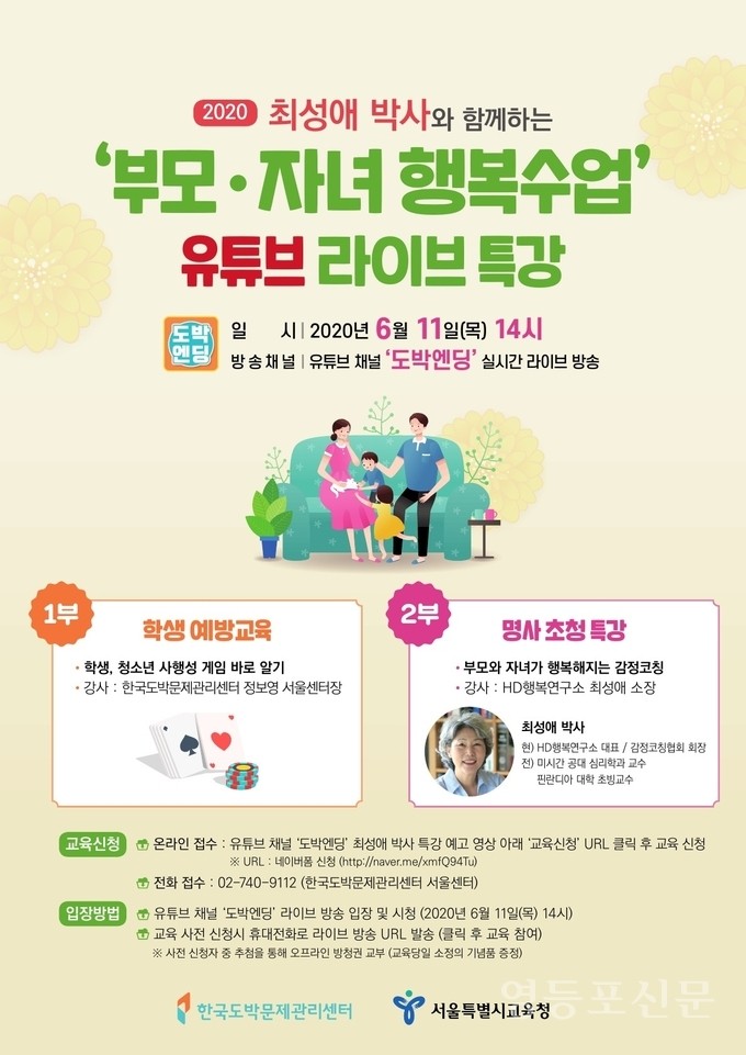 서울센터는 사전 신청자에게 교육 당일 생방송 특강 주소를 문자로 발송하며 추첨을 통해 최성애 소장의 저서를 경품으로 제공할 예정이다. 사전에 교육신청을 하지 않더라도, 11일 당일 서울센터의 유튜브 채널인 ‘도박엔딩’에 접속하면 누구나 방송을 시청할 수 있다.