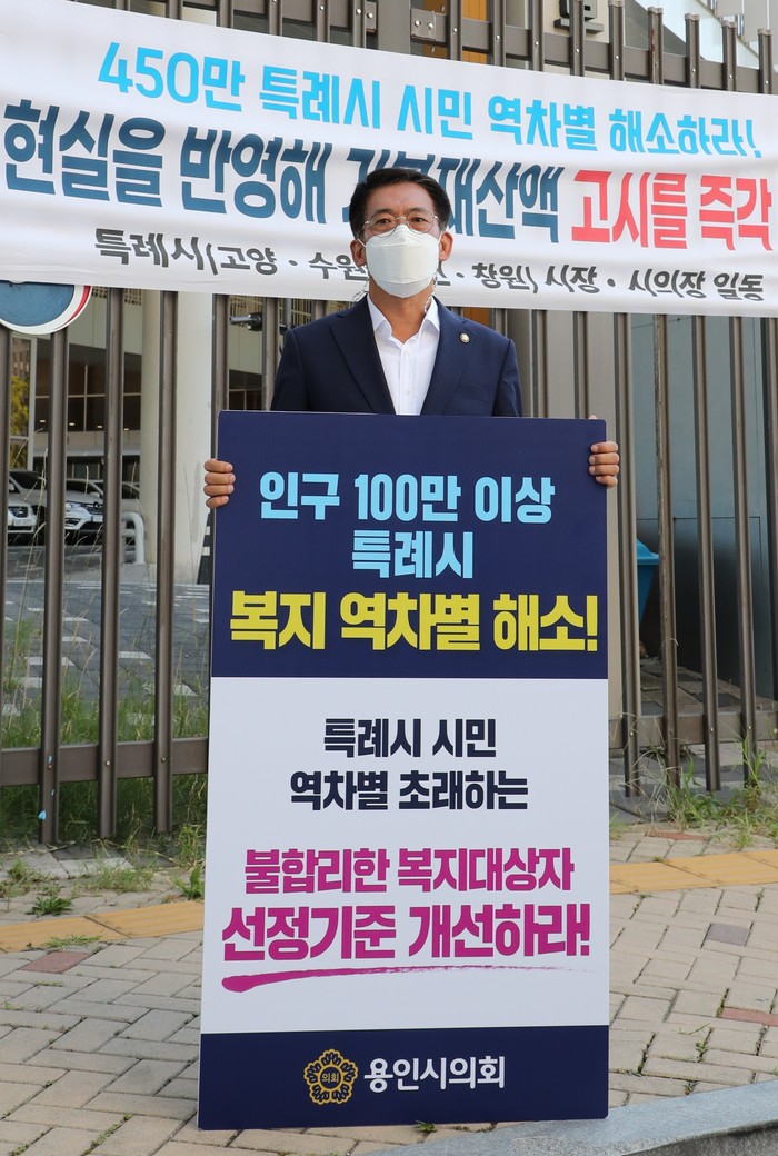 [로컬세계 고기훈 기자]경기 용인시의회(의장 김기준)는 27일 오전 10시 세종특별자치시 보건복지부 앞에서 김기준 의장과 의원들, 특례시 시장 및 의장들과 함께 사회복지 특례권한 확보를 위한 기본재산액 고시 개정을 촉구하는 4개 특례시 릴레이 1인 시위를 진행했다.