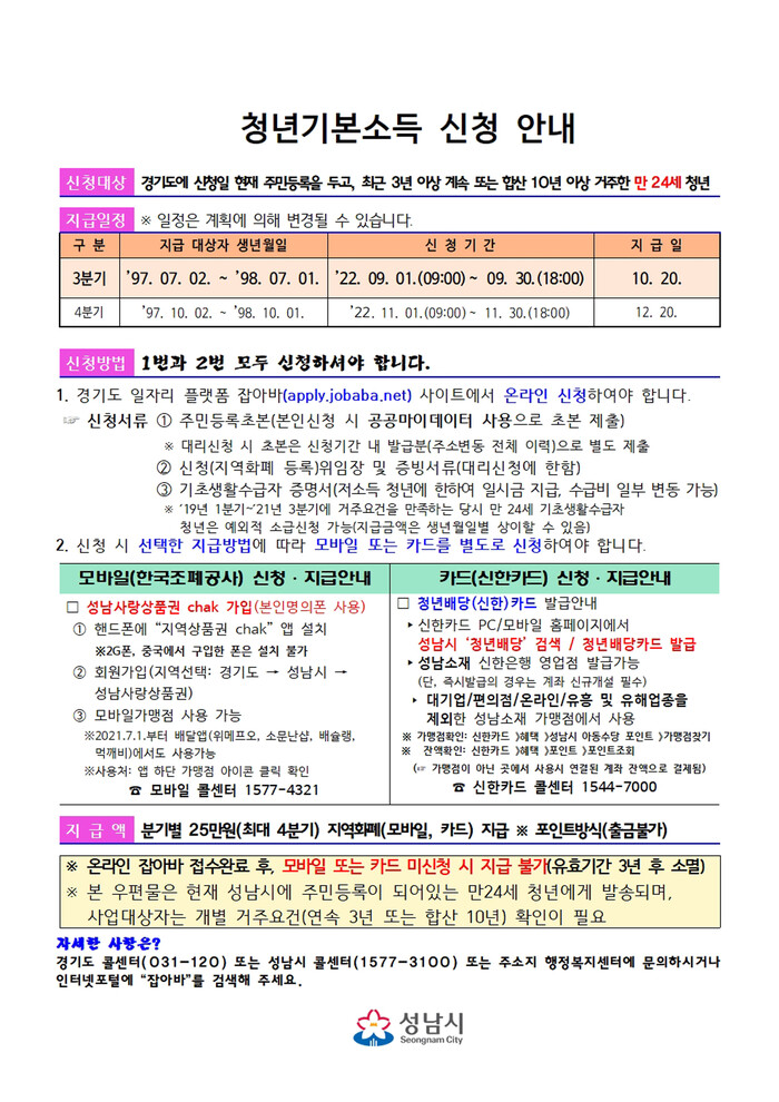 [로컬세계=김병민 기자]경기 성남시는 오는 9월 1일부터 30일까지 올해 3분기 청년기본소득 지급 신청을 받는다.