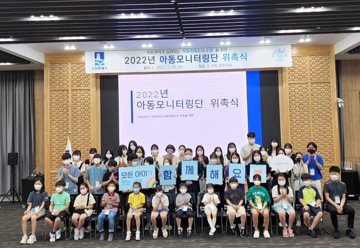 수원시는 30일 시청 중회의실에서 ‘2022년 아동모니터링단 위촉식’을 열고, 아동모니터링단 31명, 아동모니터링단 대학생 서포터즈 19명에게 위촉장을 수여했다.