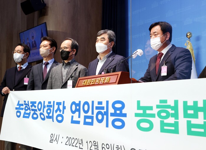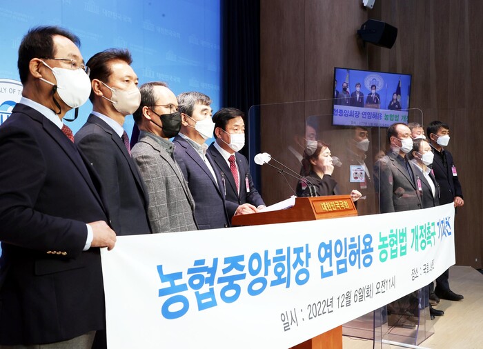 전국 농축협 조합장들은 6일 국회 소통관에서 농협중앙회장 연임제 도입을 위한 농협법 개정안의 조속한 통과를 촉구하는 기자회견을 실시했다.