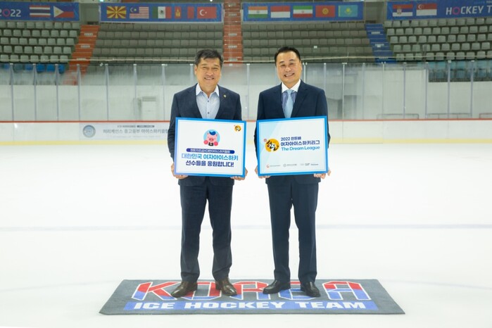 ▲지난 16일, 목동 아이스링크장에서 2022 한돈배 여자아이스하키리그 ‘더 드림 리그(The Dream League)’ 공식 후원 계약을 체결했다.(왼쪽부터 한돈자조금 손세희 위원장, 대한아이스하키협회 이호진 회장)/ 한돈자조금 제공 |