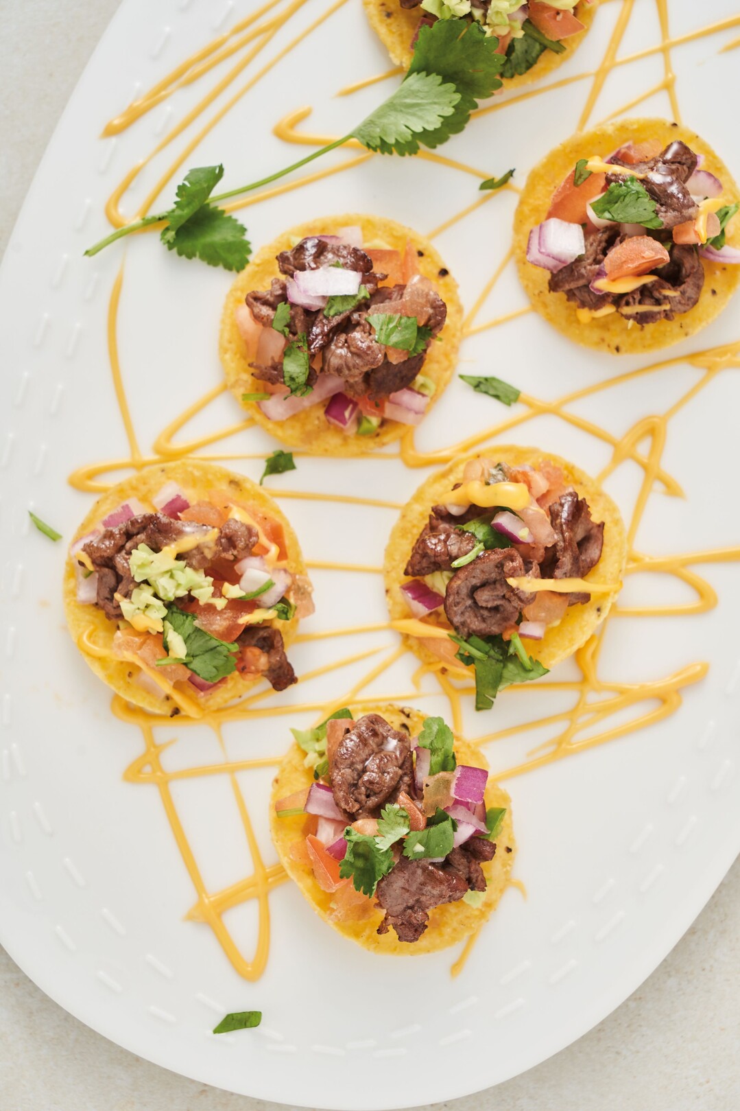 먼저 한우 설도를 타코 시즈닝과 함께 볶아 준비한다. 지방이 적고 단백질이 풍부한 설도는 담백한 풍미와 쫄깃한 식감을 살려 나초와도 잘 어우러진다. 여기에 다진 토마토와 적양파에 소금·후추·라임즙을 더해 살사를 만들고, 으깬 아보카도로 과카몰리를 준비한다. 바삭한 나초 위에 재료를 올린 뒤 치즈 소스를 더하면, 다채로운 식감과 풍미를 갖춘 한우 한입 간식이 된다.