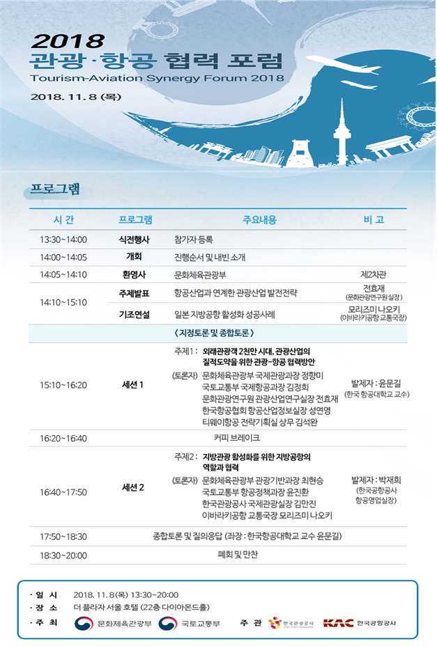 이번 포럼에서는 정부부처 및 유관 기관, 관광·항공업계 종사자 등 산·관·학·연 관련자 100여 명이 참석한 가운데 양 분야의 협력방안을 논의한다.