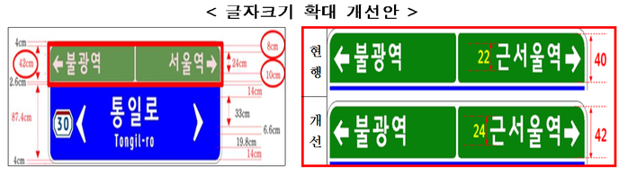 우선 도로표지를 보다 쉽게 읽을 수 있도록 도로표지판의 시설명 글자크기를 22cm에서 24cm로 확대한다.