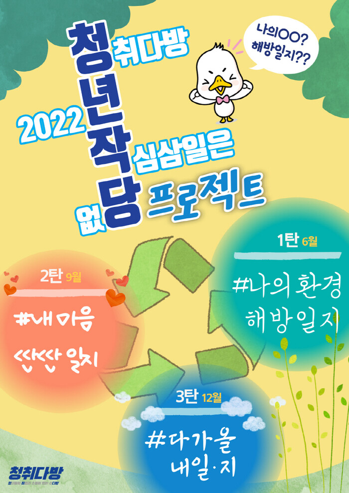 청년작당 프로젝트는 ‘청취다방 2022년 작심삼일은 없당’의 줄임말로써 혼자 달성하기 어려운 습관을 3주간 함께하는 챌린지다. 프로젝트는 각각 6월, 9월, 12월에 ▲1탄 ‘나의 환경해방일지’ ▲2탄 ‘내 마음 딴딴일지’ ▲3탄 ‘다가올 내일·지’ 라는 주제로 진행된다.