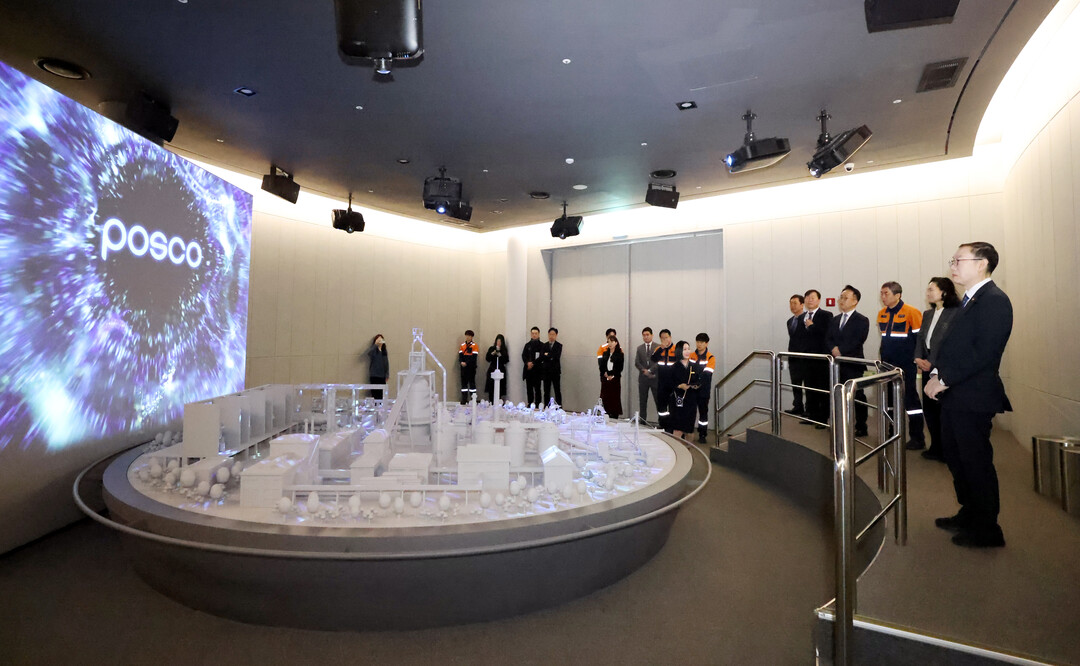 이명구 관세청장(왼쪽 두 번째)이 12일 포스코 포항제철소를 방문하여 홍보관 시설을 체험하고 있다. 관세청 제공