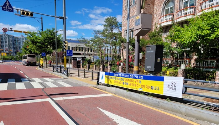 ▲예닯유치원 앞 어린이보호구역에 승하차 구역 안내 현수막과 표지판을 설치한 모습. 용인시 제공 |
