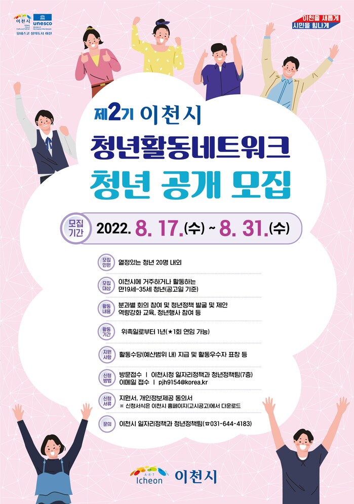 [로컬세계=김병민 기자]경기 이천시는 청년활동을 활성화하기 위해 청년들이 직접 참여하고 청년정책을 제안하는 제2기 이천시 청년활동네트워크 활동 청년을 이달 말까지 공개 모집한다고 18일 밝혔다.